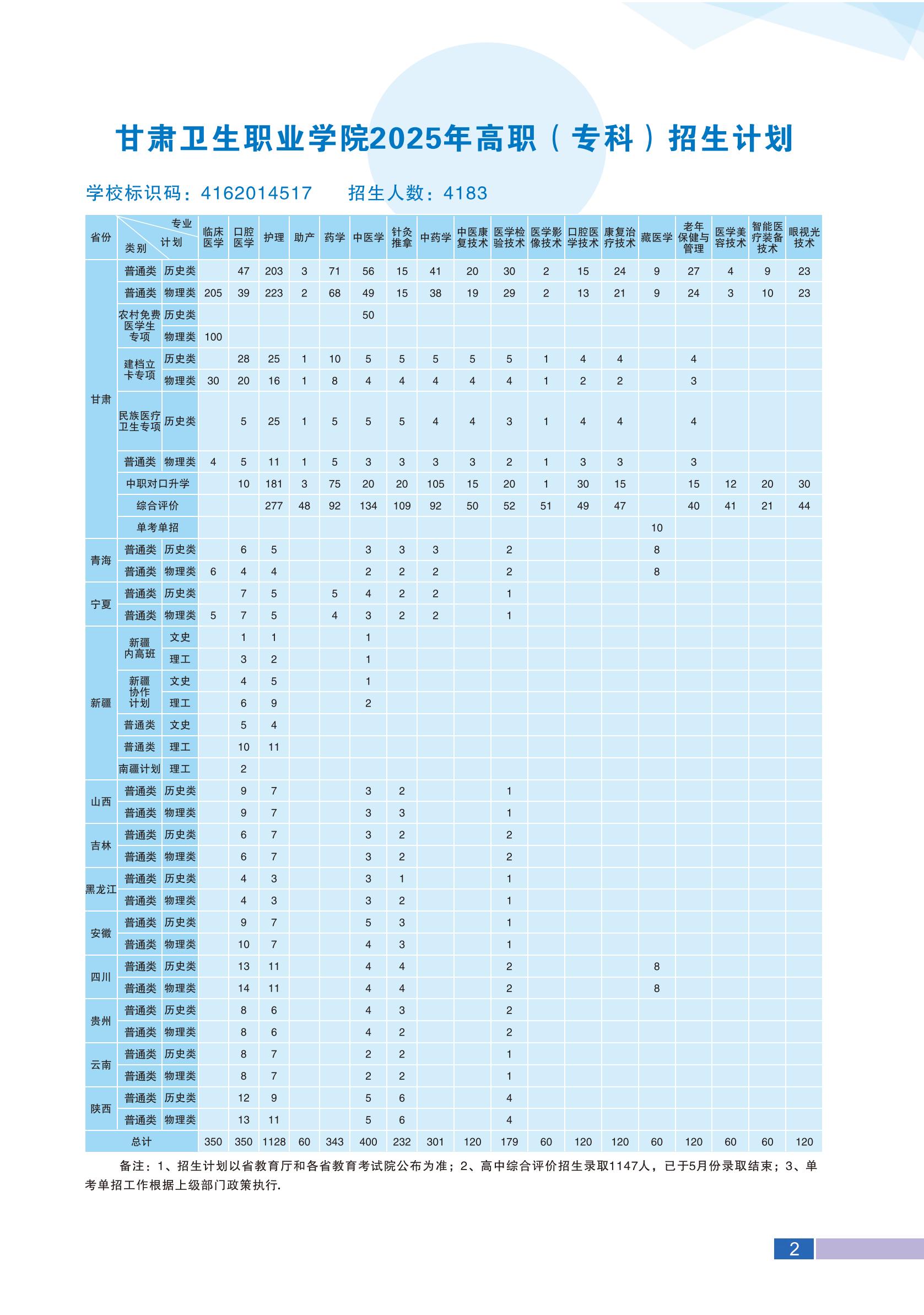 甘肅衛(wèi)生職業(yè)學(xué)院2025年高職(專科)招生計劃
