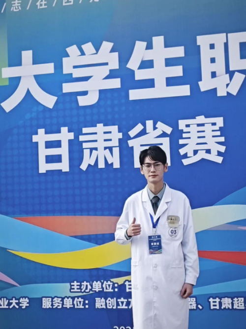 第二屆全國大學(xué)生職業(yè)規(guī)劃大賽甘肅省賽成長賽道職教組金獎獲得者2023級針灸推拿三年制27班的何星宇同學(xué)。