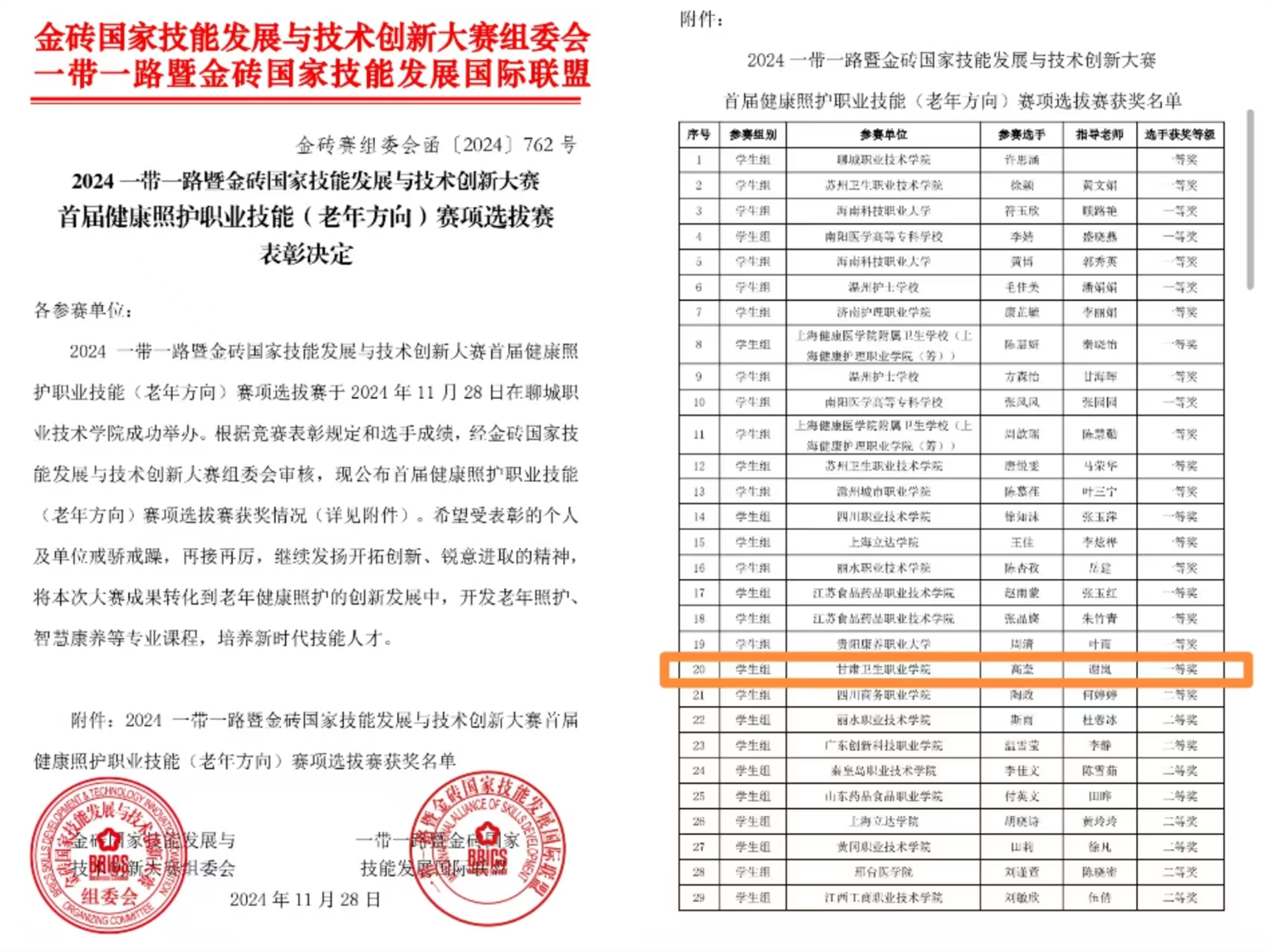 11月26日至12月1日,“2024一帶一路暨金磚國(guó)家技能發(fā)展與技術(shù)創(chuàng)新大賽”首屆健康照護(hù)職業(yè)技能(老年方向)賽項(xiàng)選拔賽在山東聊城職業(yè)技術(shù)學(xué)院舉辦。我校護(hù)理學(xué)院派出的高奎同學(xué)憑借扎實(shí)的專業(yè)技能和出色的臨場(chǎng)表現(xiàn),在來(lái)自全國(guó)25個(gè)省、自治區(qū)和直轄市111所院校的363名選手(包括3名國(guó)際選手)中名列第20名,榮獲選拔賽一等獎(jiǎng)。