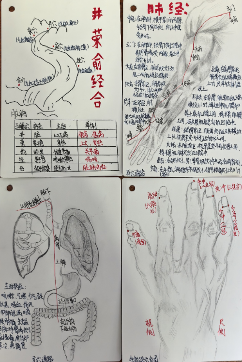 活動(dòng)過程中,同學(xué)們充分發(fā)揮主觀能動(dòng)性與創(chuàng)新思維,將晦澀復(fù)雜的經(jīng)絡(luò)循行路線、精準(zhǔn)的腧穴定位,以圖文并茂、條理清晰的形式融入小巧便攜的口袋書中。有的同學(xué)憑借精湛的手繪技藝,勾勒出人體經(jīng)絡(luò)的走向,讓抽象的經(jīng)絡(luò)知識(shí)變得生動(dòng)直觀;有的則對(duì)不同穴位的特點(diǎn)與應(yīng)用進(jìn)行系統(tǒng)對(duì)比梳理,極大提升了知識(shí)的實(shí)用性。