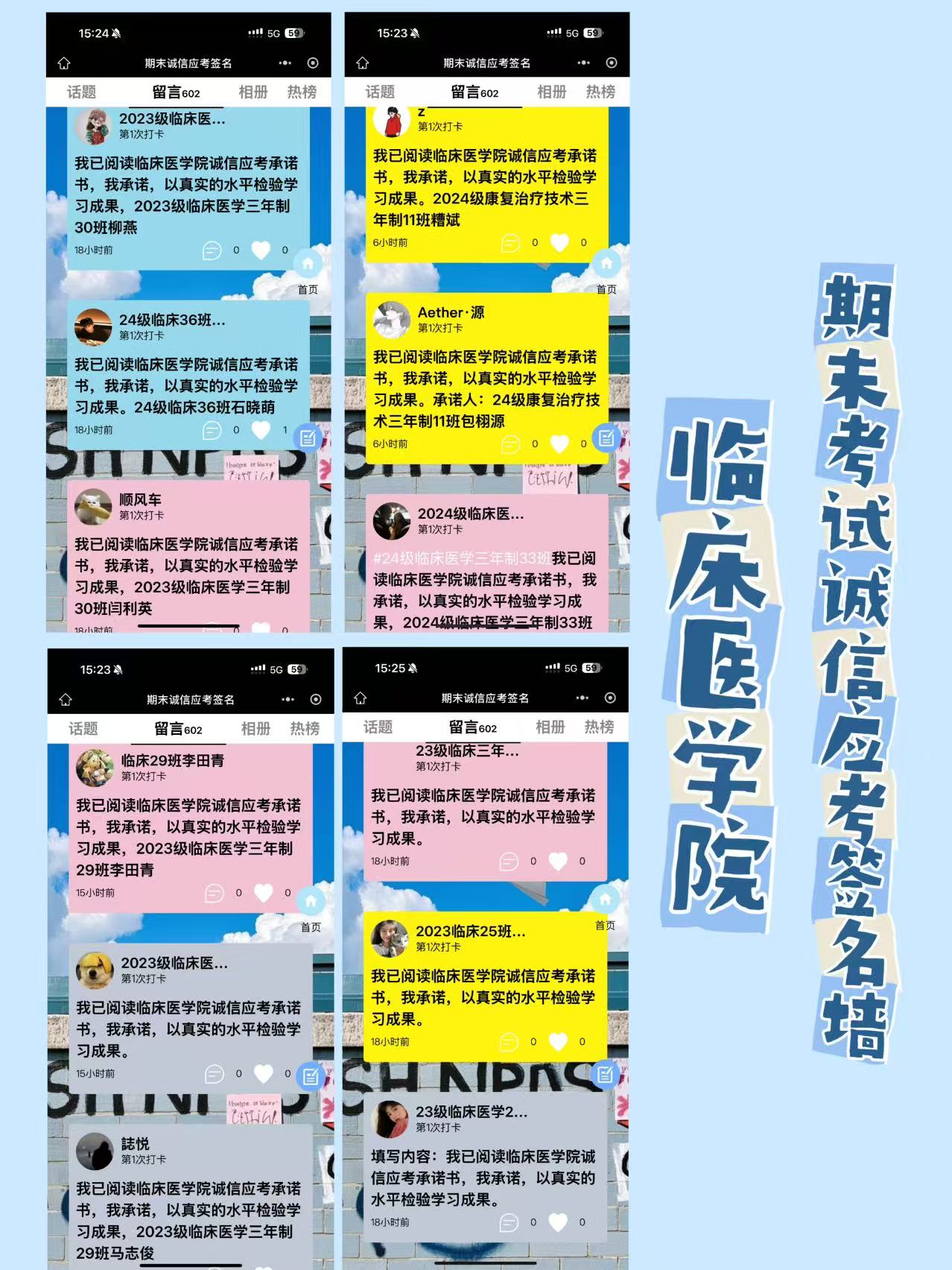 在互動(dòng)環(huán)節(jié),同學(xué)們圍繞“如何做到誠信應(yīng)考”展開熱烈討論,踴躍發(fā)言。有人提出要提前做好復(fù)習(xí)規(guī)劃,避免因知識(shí)漏洞產(chǎn)生僥幸心理;有人建議互相監(jiān)督,共同營造誠信考試氛圍。此外,學(xué)院還舉辦了以線上留言墻簽署《誠信考試承諾書》的活動(dòng),同學(xué)們鄭重地簽下自己的姓名,承諾以誠實(shí)的態(tài)度、踏實(shí)的復(fù)習(xí)來檢驗(yàn)自己這學(xué)期的學(xué)習(xí)收獲。