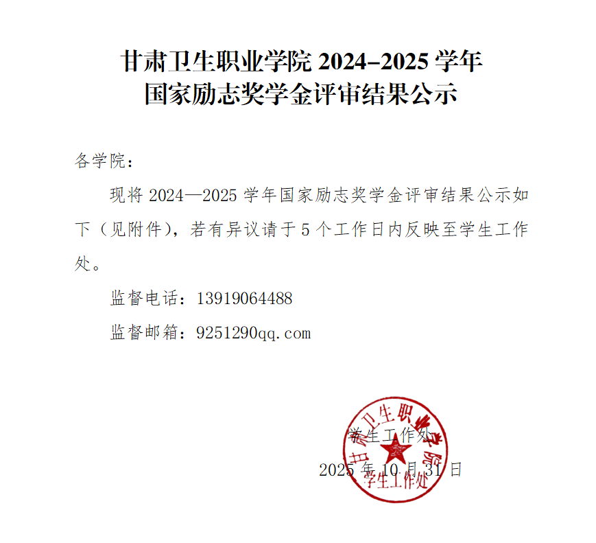 甘肅衛(wèi)生職業(yè)學(xué)院2024-2025學(xué)年國家勵(lì)志獎(jiǎng)學(xué)金評(píng)審結(jié)果公示