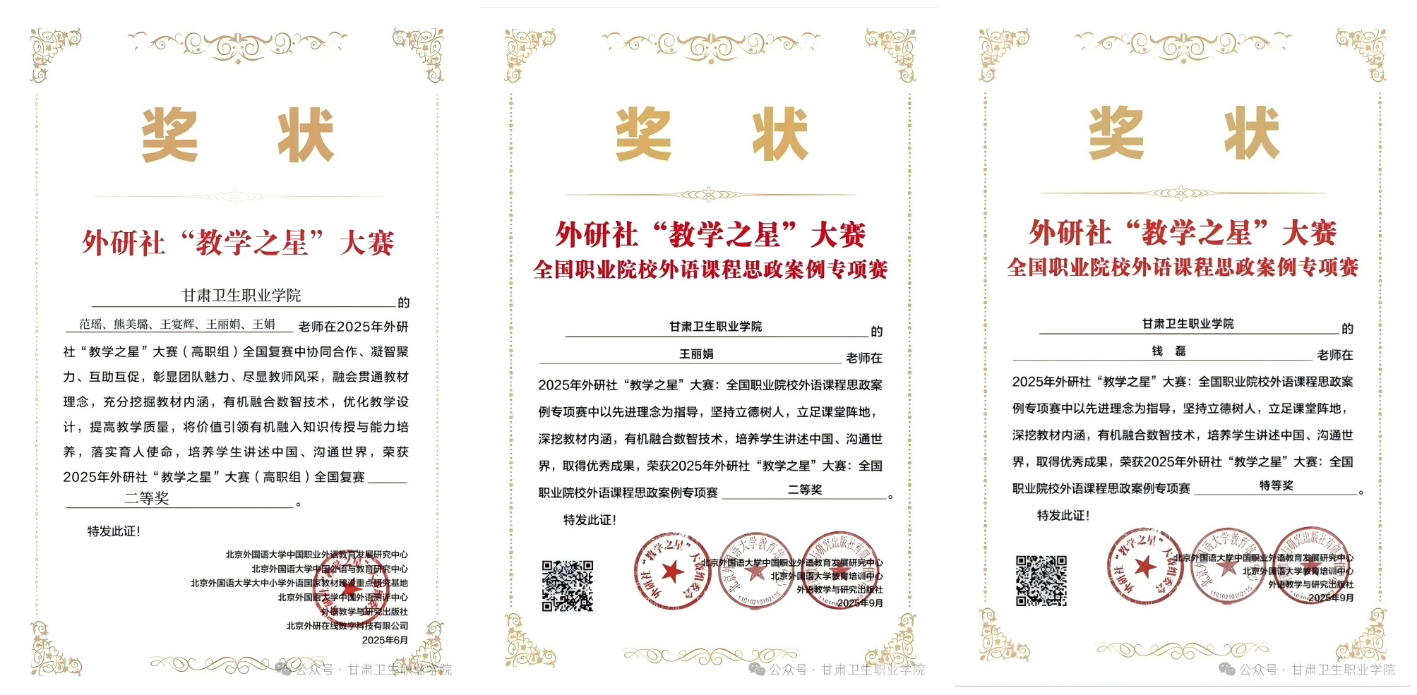 近期,學(xué)校公共教學(xué)部派教師參加了外研社“教學(xué)之星”大賽,在全國職業(yè)院校外語課程思政案例專項(xiàng)賽中,錢磊老師獲特等獎(jiǎng)、王麗娟老師獲二等獎(jiǎng),在“教學(xué)之星”大賽(高職組)全國復(fù)賽中,范瑤老師團(tuán)隊(duì)獲二等獎(jiǎng)!