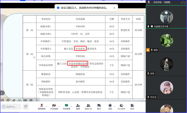 在三個(gè)半小時(shí)的深度研討中,年輕教師運(yùn)用動(dòng)態(tài)PPT與臨床案例結(jié)合的信息化創(chuàng)新教學(xué)手段進(jìn)行課程展示,將復(fù)雜的病案分析轉(zhuǎn)化為生動(dòng)的臨床呈現(xiàn);中醫(yī)執(zhí)業(yè)助理醫(yī)師資格考試備考輔導(dǎo)授課教師通過(guò)列表、視頻等直觀形式梳理考點(diǎn),配以歷年真題大數(shù)據(jù)分析,深入剖析考綱要求體系及難點(diǎn),毫無(wú)保留地分享高效備考輔導(dǎo)技巧,充分展現(xiàn)出扎實(shí)的專業(yè)功底和積極創(chuàng)新的教學(xué)態(tài)度。教學(xué)展示全程采用互動(dòng)模式,主屏共享呈現(xiàn)課件,音頻視頻實(shí)時(shí)點(diǎn)評(píng),加深交流研討臨場(chǎng)感。