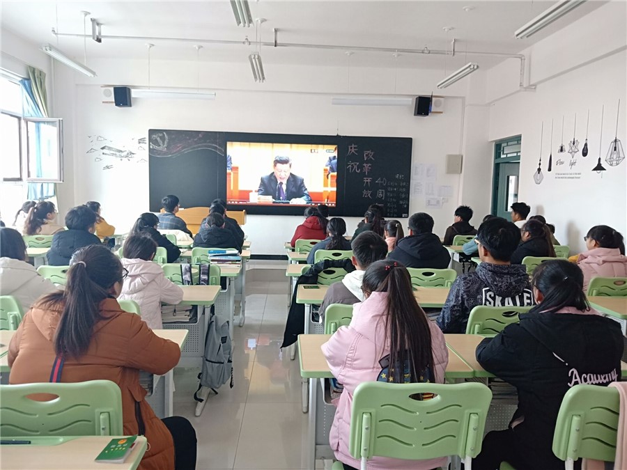 12月18日下午,校團委組織全校130余個團支部5000余名學生分別在各自教室收看了“慶祝改革開放40周年大會”直播,認真學習領會習近平總書記的重要講話精神,共同回顧、感受改革開放給人們生活帶來的巨大變化。