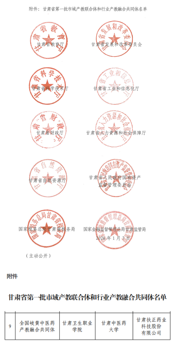 近日,甘肅省教育廳等十部門聯(lián)合發(fā)布《關(guān)于公布甘肅省第一批市域產(chǎn)教聯(lián)合體和行業(yè)產(chǎn)教融合共同體名單的通知》(甘教職成函〔2026〕3號),正式公布首批3個市域產(chǎn)教聯(lián)合體和15個行業(yè)產(chǎn)教融合共同體建設(shè)名單。其中,由甘肅衛(wèi)生職業(yè)學(xué)院牽頭,聯(lián)合甘肅中醫(yī)藥大學(xué)、甘肅扶正藥業(yè)科技股份有限公司共同申報(bào)的“全國岐黃中醫(yī)藥產(chǎn)教融合共同體”成功入選,標(biāo)志著甘肅省在中醫(yī)藥領(lǐng)域產(chǎn)教融合與協(xié)同育人方面邁出重要一步。
