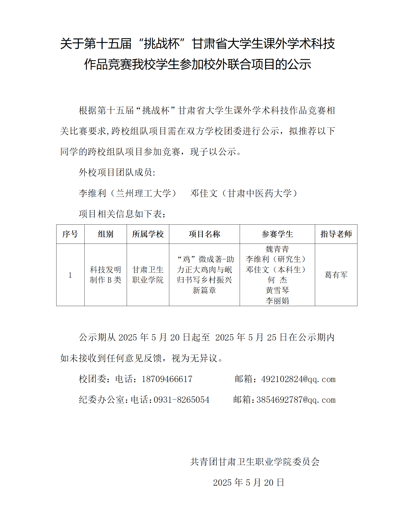 關于第十五屆“挑戰(zhàn)杯”甘肅省大學生課外學術科技作品競賽我校學生參加校外聯(lián)合項目的公示