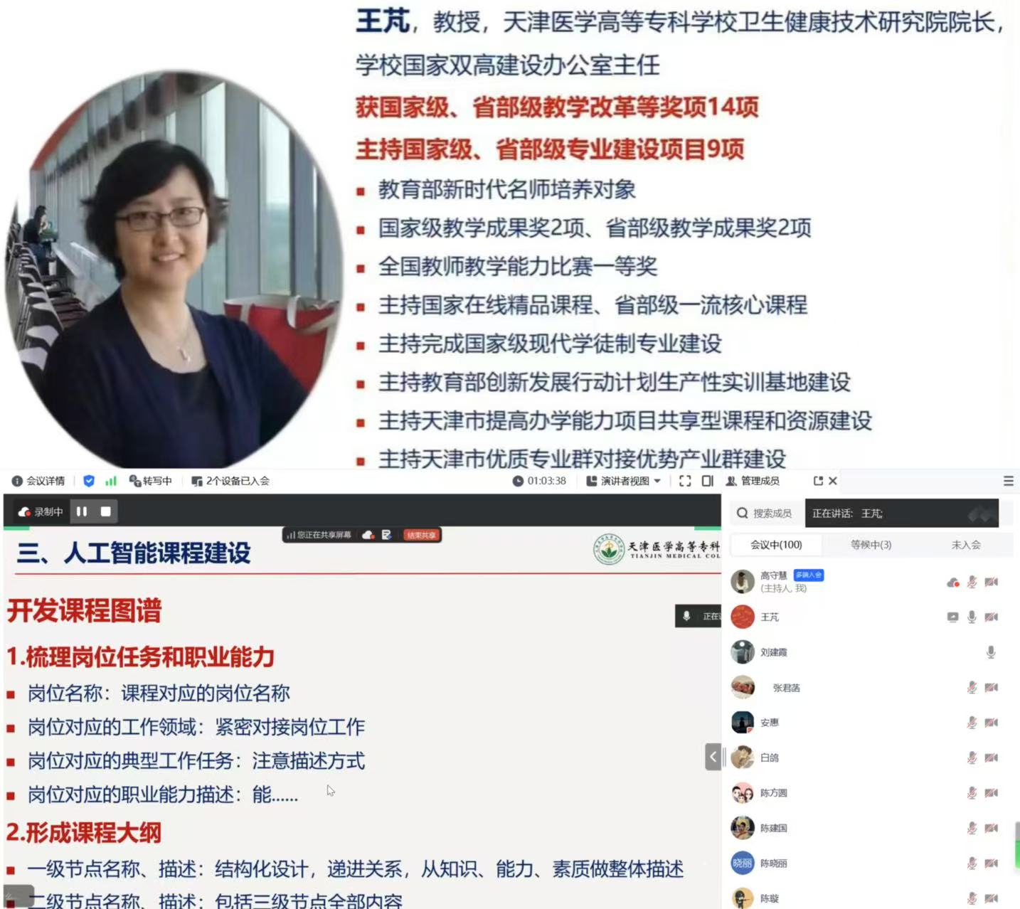 本次培訓(xùn)精準(zhǔn)對(duì)接當(dāng)前課程建設(shè)核心需求,特邀天津醫(yī)學(xué)高等專科學(xué)校王芃教授作專題分享。作為國(guó)家級(jí)在線精品課程負(fù)責(zé)人、全國(guó)教師教學(xué)能力比賽一等獎(jiǎng)獲得者,王芃教授以“人工智能賦能課程建設(shè)與改革”為主題,系統(tǒng)闡述了課程圖譜構(gòu)建方法,展示了如何將新技術(shù)、新標(biāo)準(zhǔn)、新規(guī)范融入課程內(nèi)容,同時(shí)結(jié)合課程建設(shè)實(shí)例,分享了課程模塊化設(shè)計(jì)與課程思政有機(jī)融合的實(shí)踐經(jīng)驗(yàn)。
