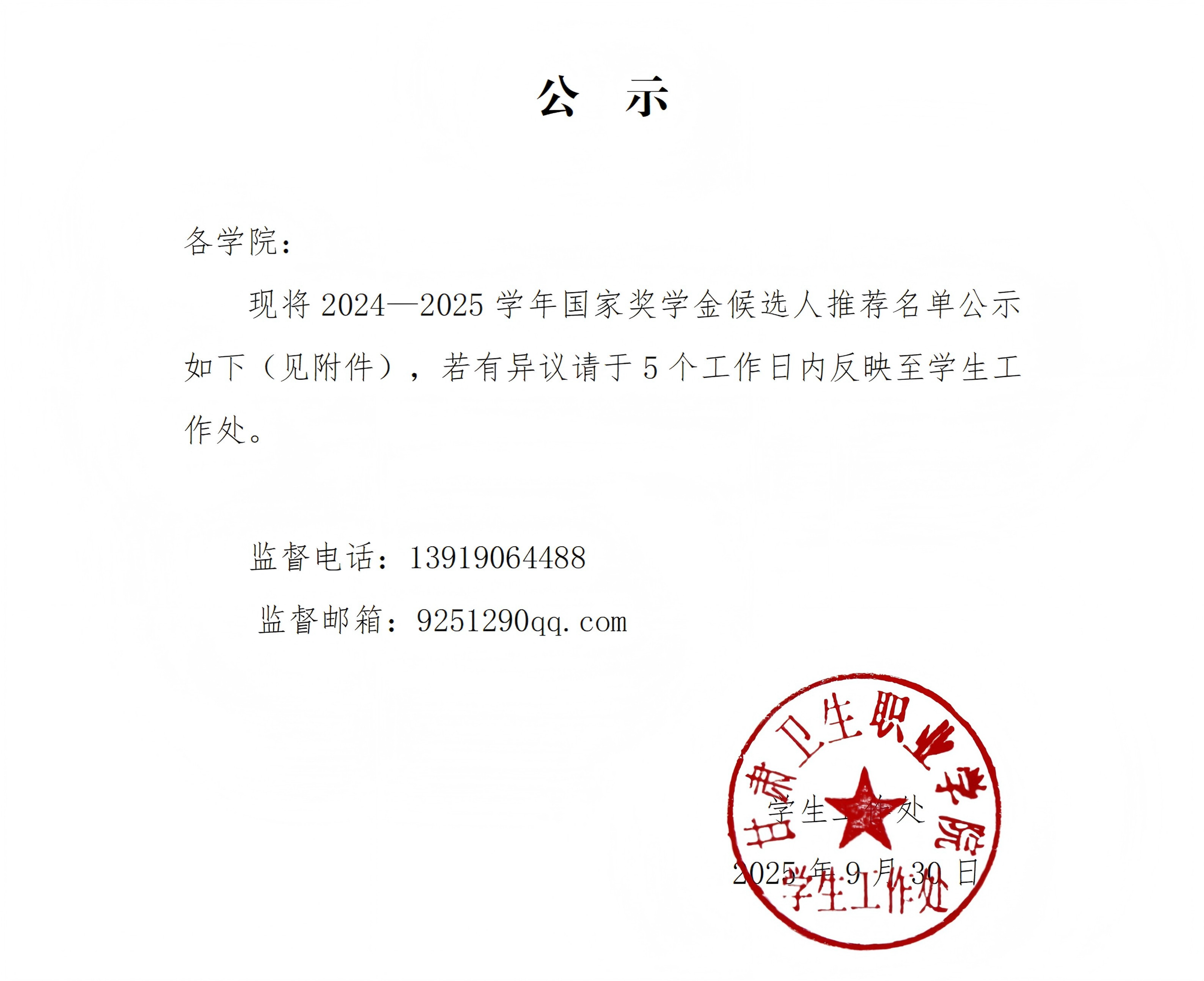 甘肅衛(wèi)生職業(yè)學院2024-2025學年高職國家獎學金公示