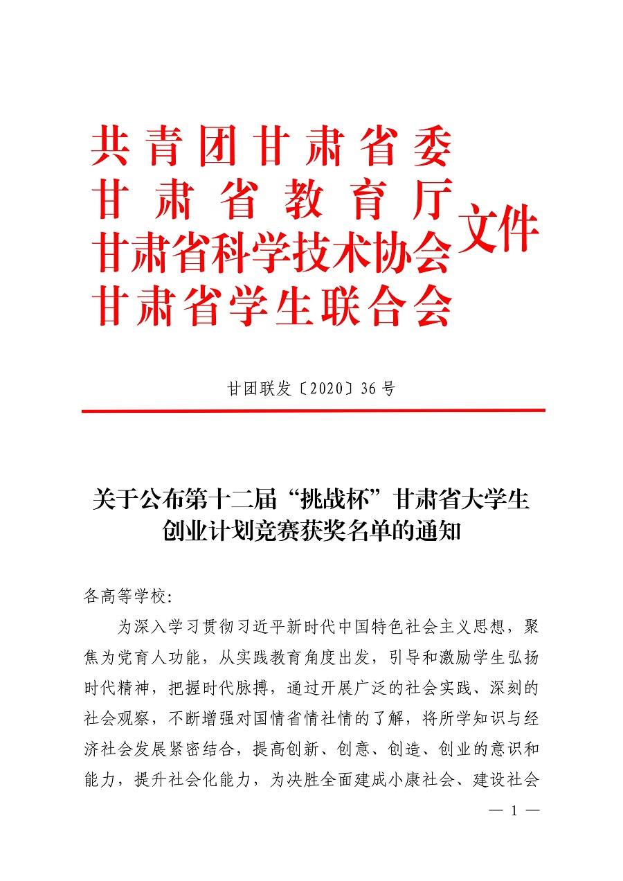 我校在第十二屆“挑戰(zhàn)杯”甘肅省大學(xué)生創(chuàng)業(yè)計劃競賽中獲獎